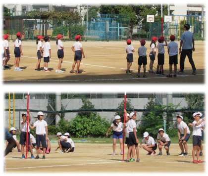 5年生の練習の様子です。運動場で、団体競技(棒引き)の練習に取り組みました。