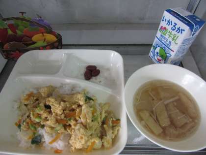 本日の給食の献立をご紹介します。本日の献立は、親子どんぶり、冬瓜のすまし汁、金時豆の煮物、牛乳でした。