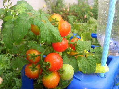 雨降りの月曜日です。2年生のミニトマトが、雨に濡れて赤く光っています。