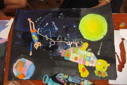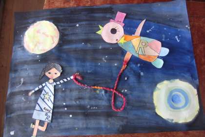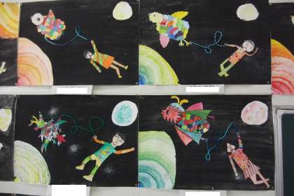 5年生の図画工作「2014 宇宙の旅」をご紹介します。一枚一枚、羽の色を塗り分けて鳥を描きました。そして、その鳥が宇宙に舞っているように表現しました。宇宙空間に浮かぶ星や、宇宙空間を漂う「自分」の姿も工夫して、画面の中に配置することができました。