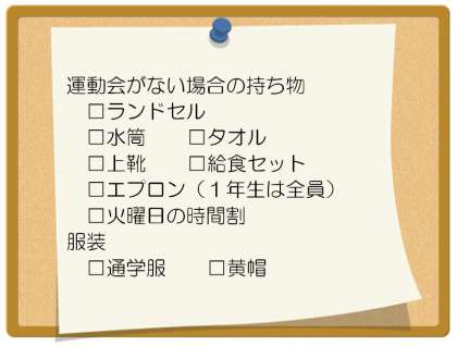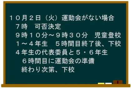 火曜日、晴天であっても、運動場の状況によっては(飛来物がある、危険なものが落ちている等)、運動会を実施できない場合があります。その場合は運動会を10月3日(水)に順延し、10月2日(火)は火曜日の時間割で行います。