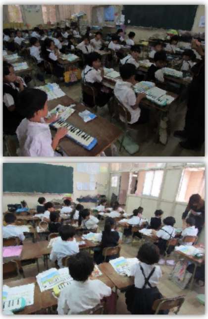 1年生の音楽の学習です。鍵盤ハーモニカで「どんぐりさんのおうち」を吹き、「ド」や「ソ」の位置を確かめています。