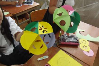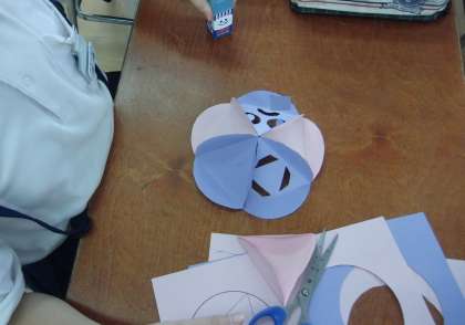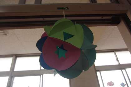 正二十面体を作るためには、どの頂点にも5枚の正三角形が集まるようにしなければいけません。貼りあわせるのが少々難しかったです。今日、完成しなかった子ども達は、次回の図画工作の時間に頑張ります。
