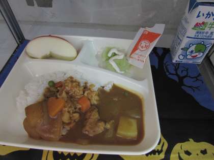 本日の献立は、ポークカレーライス、キャベツのサラダ、りんご、牛乳でした。