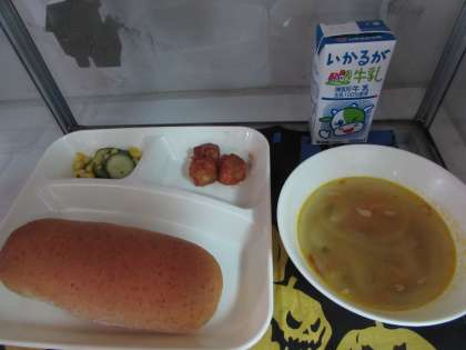 本日献立は、ライ麦パン、牛乳、まぐろのオーロラ煮、スープ、きゅうりとコーンのゆずドレッシングでした。