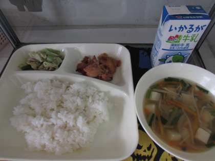 本日の献立は、ご飯、牛乳、鶏肉のチリソース焼き、豆腐とワンタンの皮のスープ、中華炒めでした。