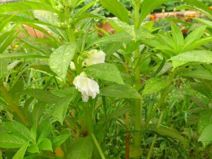 各学年の学習園では、植物たちがぐんぐん育っています。3年生の学習園では白いホウセンカの花が、1年生の学習園では赤いホウセンカの花が咲いていました。夏休み、プール開放や図書館開放で学校に来たときにも、観察をしてみましょう。