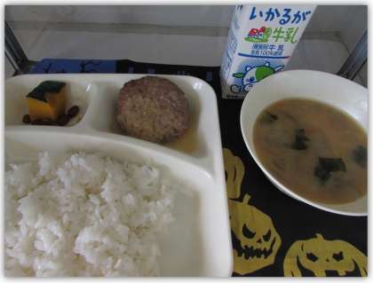本日の給食の献立をご紹介します。本日の献立は、ご飯、牛乳、和風おろしハンバーグ、みそ汁、かぼちゃのいとこ煮でした。