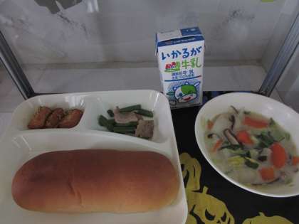 本日の給食の献立をご紹介します。本日の献立は、黒糖パン、白菜のクリーム煮、厚揚げの胡麻じょうゆかけ、豚肉と三度豆のオイスターソース炒め、牛乳でした。