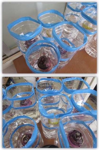 2年生が生活科の学習で、ヒヤシンスの水栽培をしています。廊下の靴箱の上に置き、子どもたちは早く花が咲かないかな、と楽しみにしています。