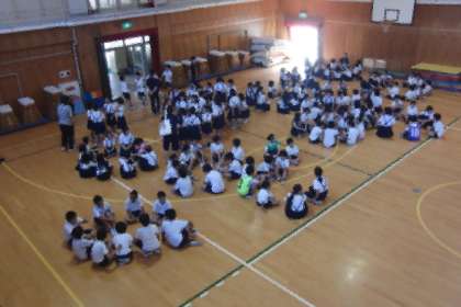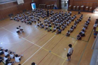 木曜日の朝、児童集会です。本日は集会委員会の取り組みで、「もうじゅうがりゲーム」をしました。司会の集会委員の子が動物の名前を言うと、その名前の文字数と同じ数の人数で集まります。「ライオン」なら4人、「イリオモテヤマネコ」なら9人、です。