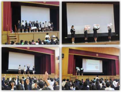 本日の集会は、図書委員会の発表です。学校図書館に関するクイズや、本の読み聞かせを行いました。