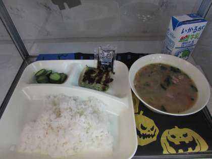 本日の給食の献立をご紹介します。本日の献立は、ご飯、牛乳、お好み焼き、豚汁、きゅうりの梅風味でした。