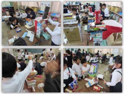 1年生の図画工作学習です。持ち寄った箱を、班ごとに高く高く積み上げていきました。高く積み上げるには、どのような順番で重ねていけばよいか、考えました。