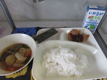 本日の給食の献立をご紹介します。本日の献立は、ご飯、牛乳、みそカツ、じゃがいもと野菜の煮もの、焼きのりでした。