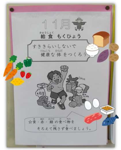 11月の給食目標です。11月の目標は、『すききらいしないで健康な体をつくろう』です。
