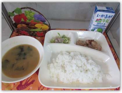本日の給食の献立をご紹介します。本日の献立は、鶏肉のしょうゆマヨネーズ焼き、なめこのみそ汁、キャベツの炒め物、ご飯、牛乳でした。