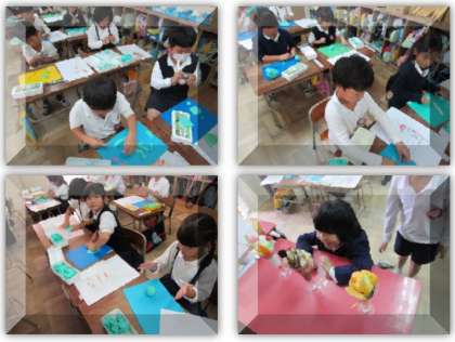 1年生の図画工作の学習です。1年生は、作品展で『パフェ』を展示します。紙粘土などを使って作りますが、まずは油粘土で、どんなものが作れるのか試してみました。