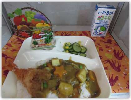 本日の給食の献立をご紹介します。本日の献立は、えびフライカレーライス、きゅうりとコーンのサラダ、豆こんぶ、牛乳でした。