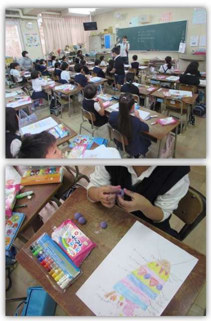 1年生の図画工作の学習です。紙粘土を使って、おいしそうなパフェを作っています。
