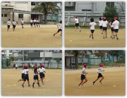 6年生の体育の学習です。準備運度として5分走に取り組んだ後、走り幅跳びを行いました。タブレットで撮影をし、自分の跳ぶフォームを点検しました。
