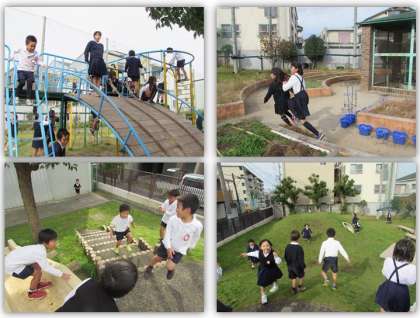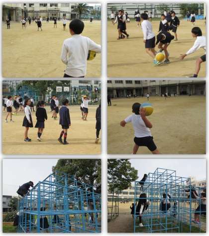 お昼休みになりました。子どもたちが運動場に出て、元気に遊んでいます。