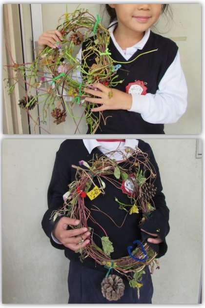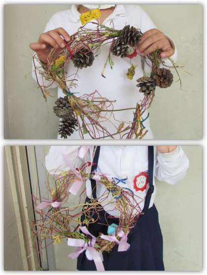 1年生は育てたアサガオを使って、リースを作りました。まつぼっくりを吊るしたり、持ってきた材料を使って飾り付けていきました。