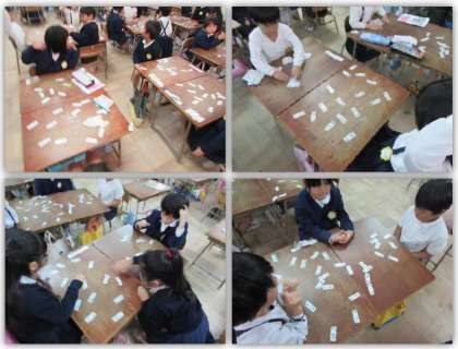 1組は、計算カードしりとり(画像1・2段目)、2組はカード取り(画像3・4段目)を行っています。