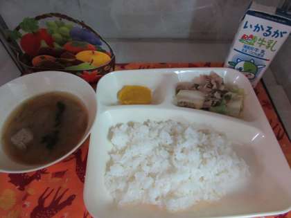 本日の給食の献立をご紹介します。本日の献立は、ご飯、牛乳、豚肉とまいたけの炒めもの、つみれ汁、カボチャういろうでした。