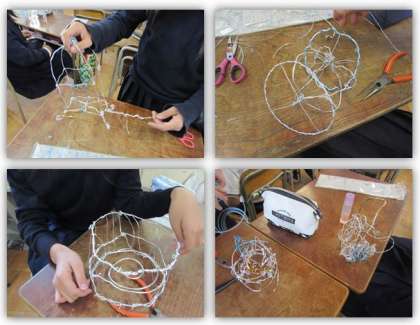 5年生の図画工作の学習です。アルミ針金を曲げたりねじったりして、立体を作っていきました。