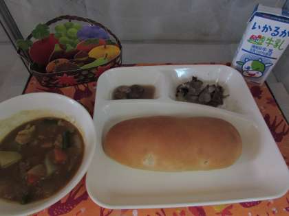 本日の給食の献立をご紹介します。本日の献立は、おさつパン、牛乳、牛肉の香味焼き、豚肉とだいこんのカレー煮、うずら豆のグラッセでした。