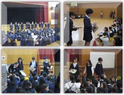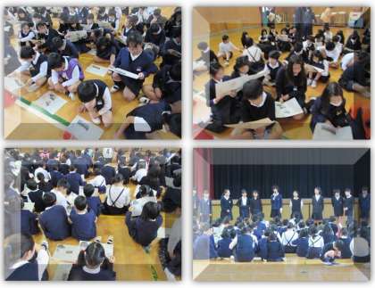 本日の児童集会は、新聞掲示委員会の発表でした。作った新聞を配り、皆に読んでもらいました。