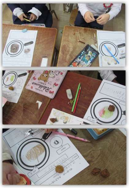 1年生の生活科の学習です。学習園で採ったフウセンカズラの実や、中の種を観察しました。