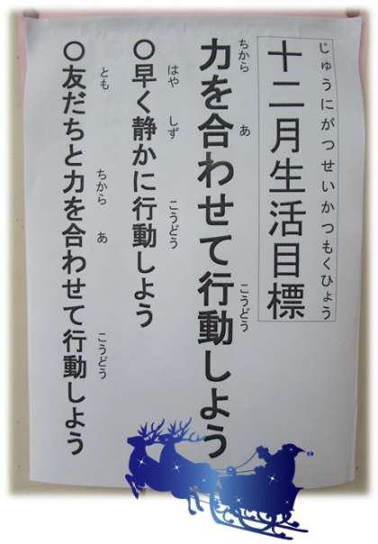 12月の生活目標です。12月の目標は、『力を合わせて行動しよう』です。具体目標は、