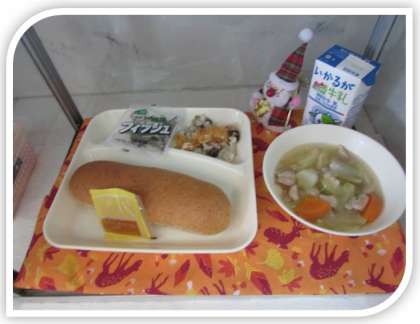 本日の給食の献立をご紹介します。本日の献立は、ライ麦パン、牛乳、鶏肉とじゃがいものスープ煮、きのこのドリア、ミニフィッシュでした。