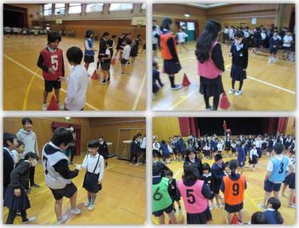 今日の集会は「じゃんけんリレー」です。リーダーのところに行って、じゃんけんをし、リーダーに勝つか引き分けると、リーダーの後ろに並び、負ければ元に戻ります。班の全員がリーダーの後ろに並んだら、終了です。