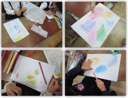 1年生の生活科の学習です。昨日、公園で拾ってきた葉を使って、こすり出しをしました。葉の上に紙を置いて、色鉛筆で素早くこすっていきます。うまく葉の形や葉脈が浮かび上がってきたときには、「やったあ」という声があがりました。