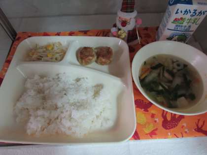 本日の給食の献立をご紹介します。本日の献立は、ご飯、牛乳、揚げシューマイ、えびと豆腐のスープ、もやしとコーンのピリ辛あえでした。