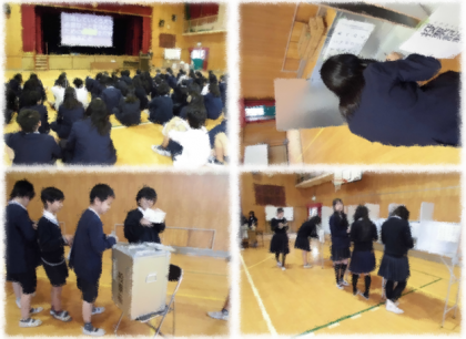 初めにクイズを通して、選挙について学び、その後、模擬選挙を行いました。初めての投票を体験することができました。