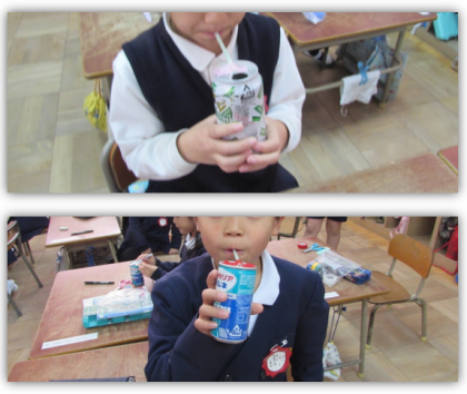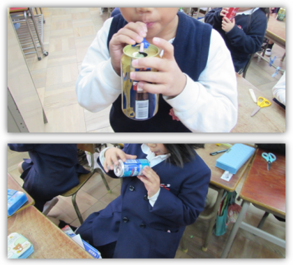 1年生の生活科の学習です。空き缶とストローを使って、笛を作りました。