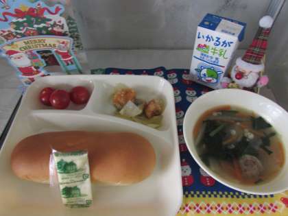 本日の給食の献立をご紹介します。本日の献立は、コッペパン、牛乳、マーガリン、鮭のマリネ、肉団子と麦のスープ、プチトマトでした。