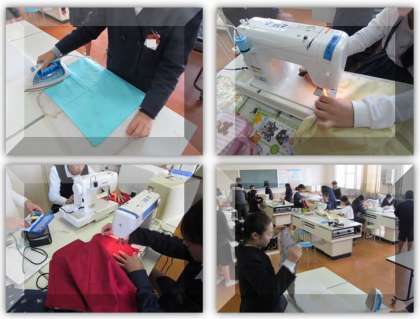 6年生の家庭科の学習です。家庭科室に行ってミシンを使い、ランチョンマットを作っています。