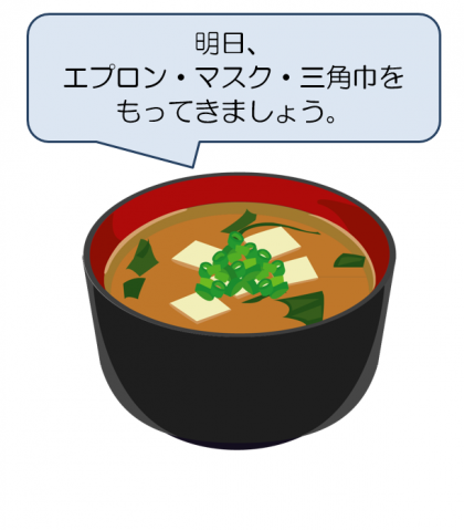 準備物の点検をしますので、明日、エプロン、マスク、三角巾を手提げやナップサックなどに入れて、もたせてください。