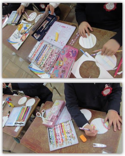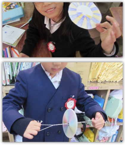 1年生の生活科の学習です。ぶんぶんごまを作って、遊びました。