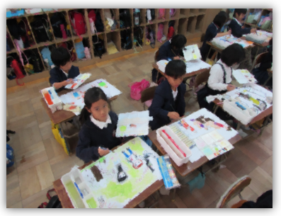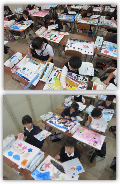 1年生の図画工作の学習です。日記で書いた事柄を、絵で表現しました。今日は、絵の具で彩色しました。