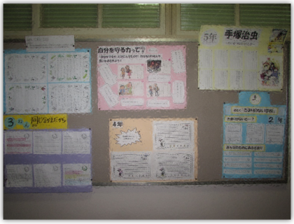 職員室前の掲示板に、各学年の道徳の実践についての記録を掲示してあります。