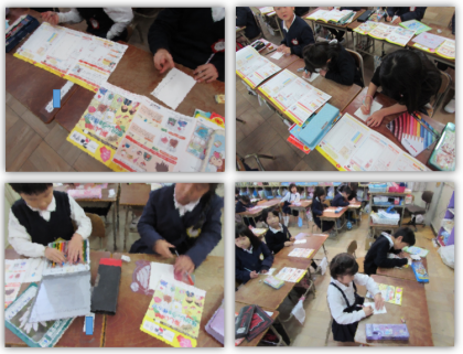 1年生の国語の学習です。今日は、年賀状を書きました。誰に出そうかな、と考えながら、通信面(裏面)を書いています。