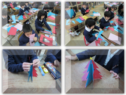 1年生の生活科の学習です。同じ形の色画用紙を5枚張り合わせて、ツリーを作りました。色画用紙を半分に折り、線に沿って丁寧に切っています。
