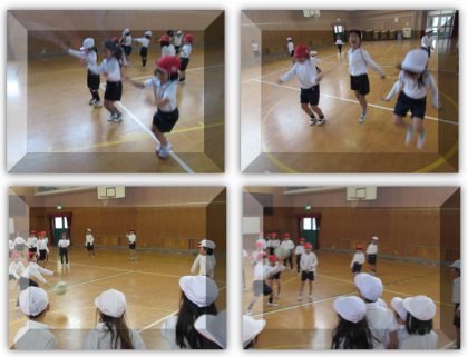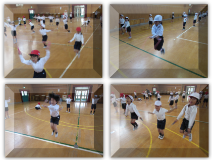 1年生の体育の学習です。体育館で、なわとび運動を行いました。一人跳び、二人跳びの後、三人跳びにもチャレンジしました。