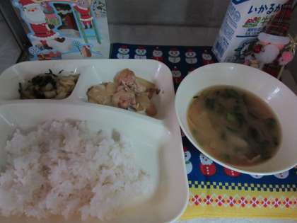 本日の献立は、ご飯、牛乳、鶏肉の甘辛焼き、みそ汁、菊菜と白菜の胡麻和えでした。